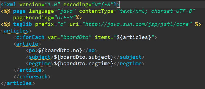 이렇게 xml이 담긴 jsp 파일을 foward 메소드 함수를 통해 ajax로 리턴해준다.