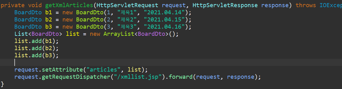 정보를 받아 request에 속성으로 넣어주고 (request.setAttribute("articles", list); 부분)