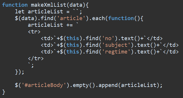 성공적으로 리턴이 될 경우, ajax의 success에서 makeXmlList(data); 함수가 호출된다. ( 위 참고 )