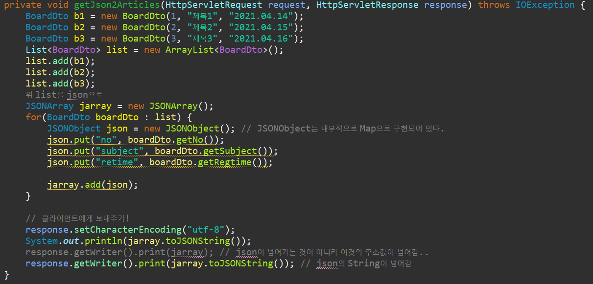 이 객체가 담긴 List를 for문을 이용해 하나하나 JSONObject에 담고, 이 JSONObject를 JSONArray에 담으면 된다.