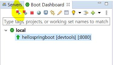 하단의 Boot Dashboard를 보면 만든 프로젝트가 있다. 형광펜으로 표시한 부분을 누르면 실행할 수 있다.
