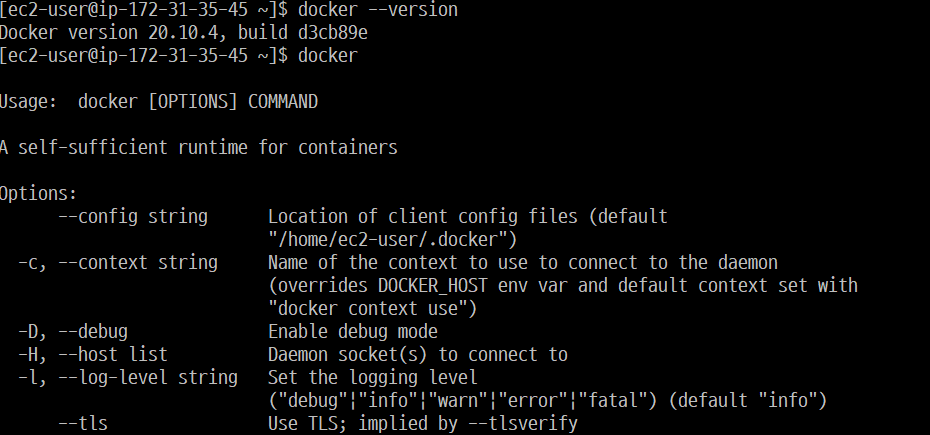 docker가 잘 설치되었는지 명령어를 통해 확인합니다.