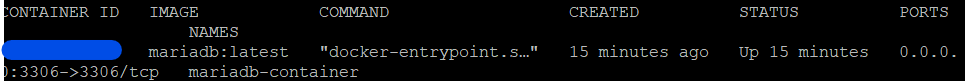 docker run --name mariadb-container -e MYSQL_ROOT_PASSWORD=<password> -d -p 3306:3306 mariadb:latest