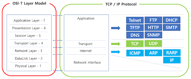 - 컴퓨터 네트워크 프로토콜 디자인과 통신을 7 계층으로 나누어 설명한 것이다.