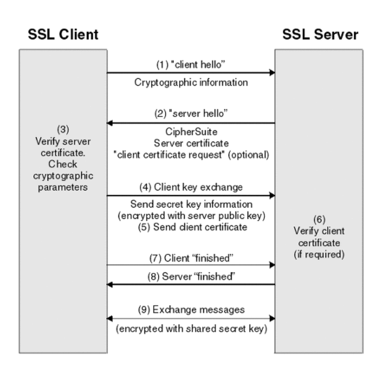 5. SSL / TLS 서버가 "클라이언트 인증서 요청"을 보낸 경우 클라이언트는 클라이언트의 디지털 인증서 또는 "디지털 인증서 없음 경고" 와 함께 클라이언트의 개인 키로 암호화 된 임의의 바이트 문자열을 보냅니다. 이 경고는 경고일 뿐이지만 일부 구현에서 클라이언트 인증이 필수일 경우 handshake 실패합니다.