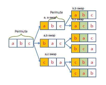 - (그림의 가운데 배열)start의 위치와 start+i를 바꾼다(swap). → (그림의 가장 오른쪽 배열 상태)start+1의 위치로 재귀함수 호출
