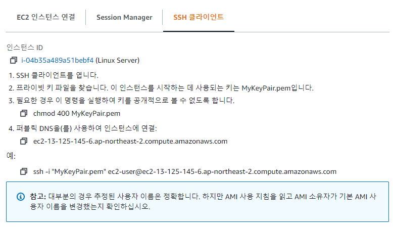 chmod 400 MyKeyPair.pem 부분은 키 페어를 읽기전용으로 변경하라는 뜻이다.